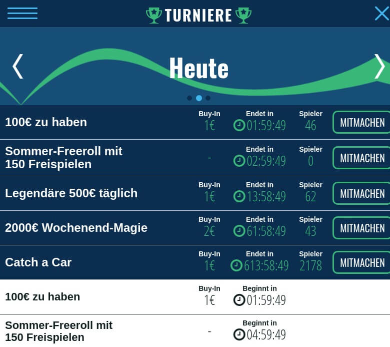 Sind Sie auf der Suche nach einer Herausforderung oder einem Nervenkitzel, um Ihren Tag etwas spannender zu gestalten? Nehmen Sie an einem oder mehreren unserer aufregenden Slots-Turniere teil, die Ihnen jeden Tag und den ganzen Tag über zur Verfügung stehen!